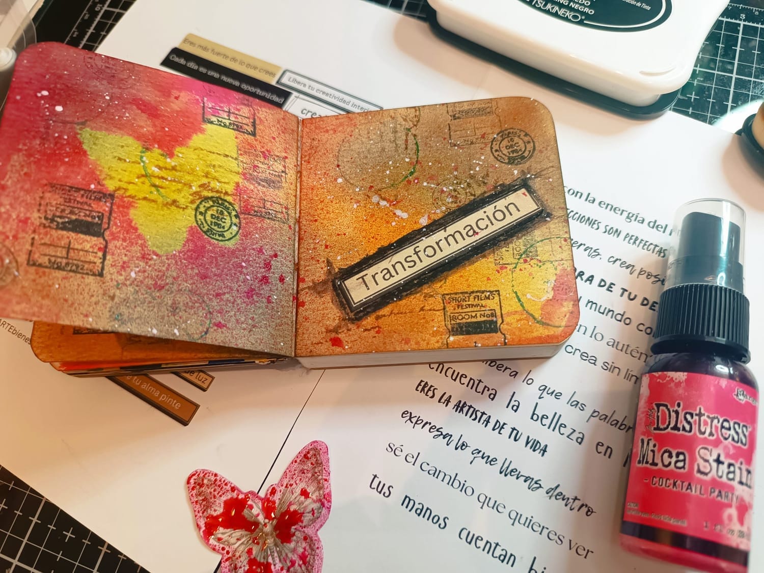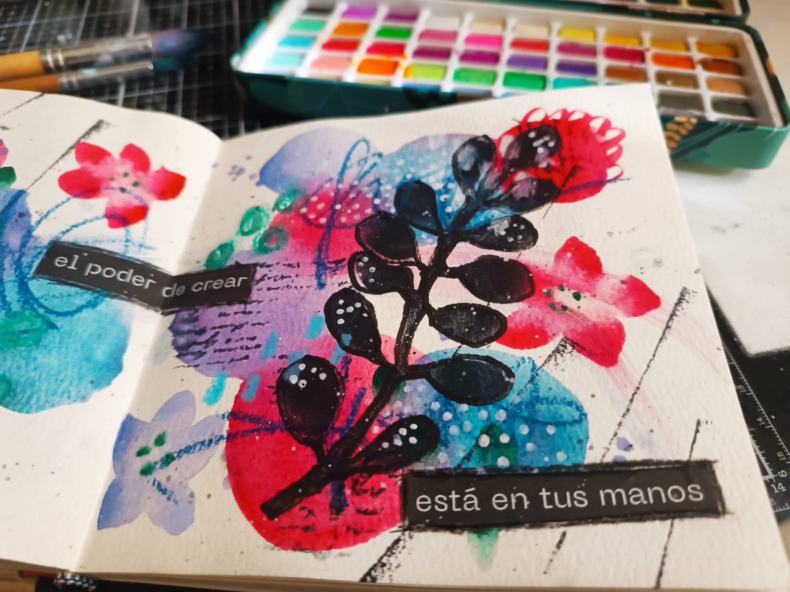 Si usas un cuaderno de arte o un diario, puedes difundir aceites esenciales en tu espacio creativo para generar un ambiente inspirador y escribir tus frases antes de comenzar a pintar o crear y/o utilizar mis frases motivadoras para finalizar una creación. Esta es mi forma favorita de hacerlo, 3 en 1, para quien tiene muchas cosas que hacer y poco tiempo.
