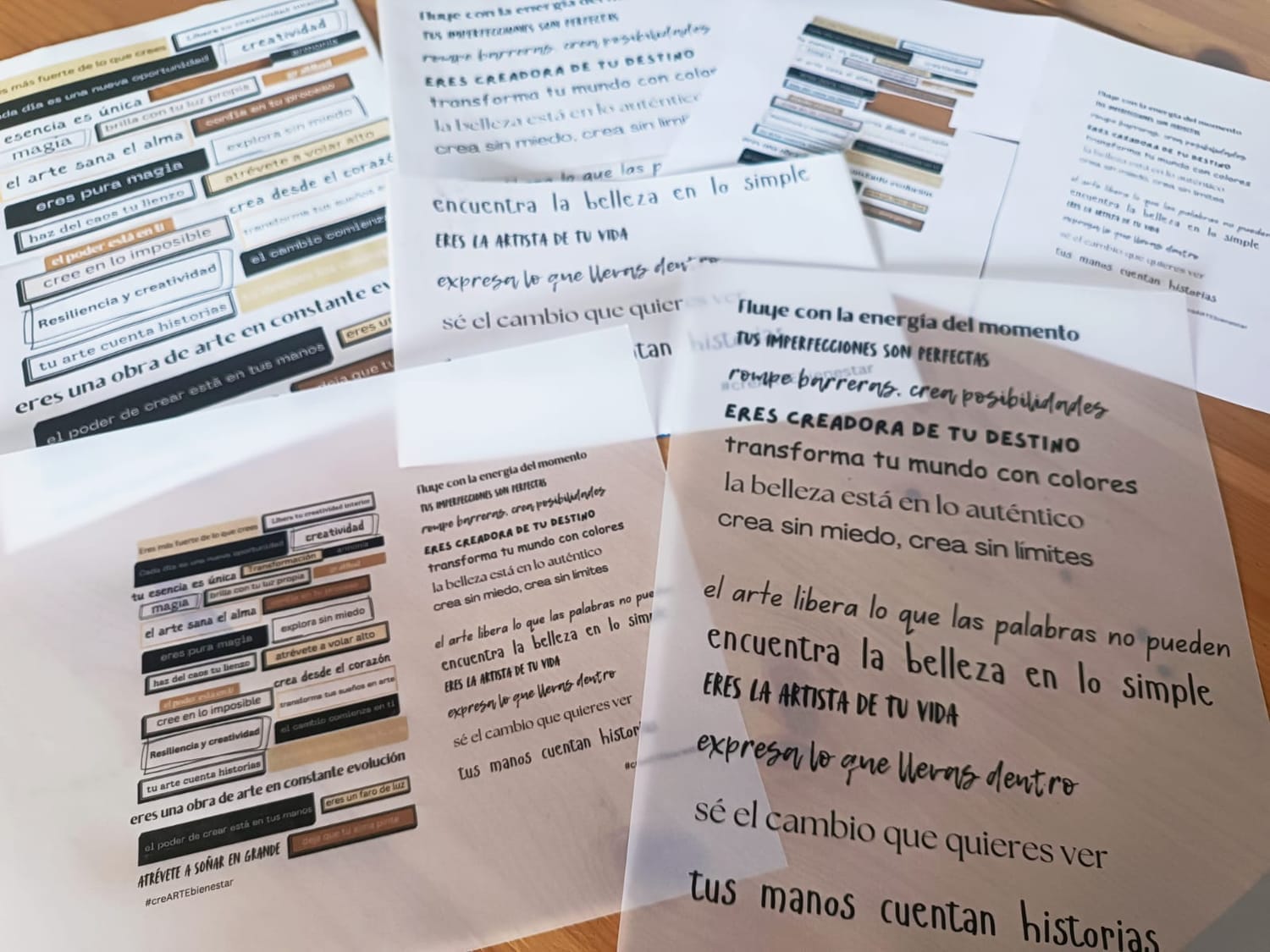 En cuanto a papel, he probado diferentes opciones: papel de impresora normal de 80gr, que luego recorto y pego en algún cartoncito reciclado, papel de gramaje superior de 120gr que es más resistente pero igual podrías utilizar cartoncito dependiendo de lo que estés haciendo, y también Vellum (papel vegetal transparente), que lo acabo de probar y queda muy bien. ¡Ah! y no nos olvidemos del papel adhesivo, siempre hay que tener a mano frases inspiradoras en formato pegatina.